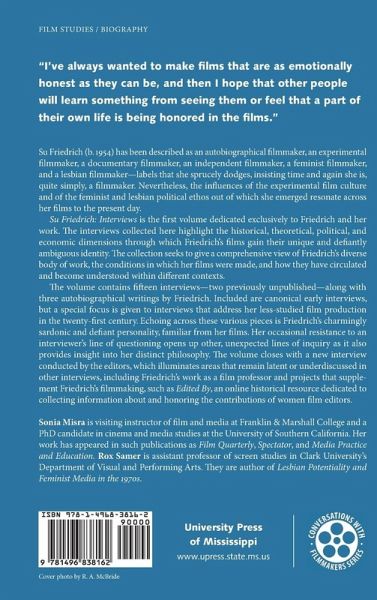 Su Friedrich (b. 1954) has been described as an autobiographical filmmaker, an experimental filmmaker, a documentary filmmaker, an independent filmmaker, a feminist filmmaker, and a lesbian filmmaker--labels that she sprucely dodges, insisting time and again she is, quite simply, a filmmaker. Nevertheless, the influences of the experimental film culture and of the feminist and lesbian political ethos out of which she emerged resonate across her films to the present day. Su Friedrich: Interviews is the first volume dedicated exclusively to Friedrich and her work. The interviews collected here highlight the historical, theoretical, political, and economic dimensions through which Friedrich's films gain their unique and defiantly ambiguous identity. The collection seeks to give a comprehensive view of Friedrich's diverse body of work, the conditions in which her films were made, and how they have circulated and become understood within different contexts. The volume contains fifteen interviews--two previously unpublished--along with three autobiographical writings by Friedrich. Included are canonical early interviews, but a special focus is given to interviews that address her less-studied film production in the twenty-first century. Echoing across these various pieces is Friedrich's charmingly sardonic and defiant personality, familiar from her films. Her occasional resistance to an interviewer's line of questioning opens up other, unexpected lines of inquiry as it also provides insight into her distinct philosophy. The volume closes with a new interview conducted by the editors, which illuminates areas that remain latent or underdiscussed in other interviews, including Friedrich's work as a film professor and projects that supplement Friedrich's filmmaking, such as Edited By, an online historical resource dedicated to collecting information about and honoring the contributions of women film editors.