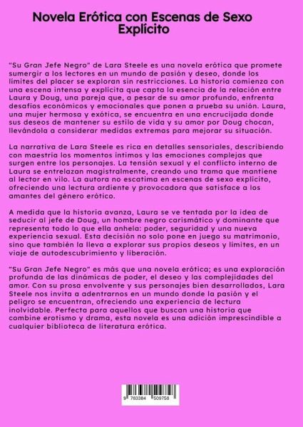 "Su Gran Jefe Negro" de Lara Steele es una novela erótica que promete sumergir a los lectores en un mundo de pasión y deseo, donde los límites del placer se exploran sin restricciones. La historia comienza con una escena intensa y explícita que capta la esencia de la relación entre Laura y Doug, una pareja que, a pesar de su amor profundo, enfrenta desafíos económicos y emocionales que ponen a prueba su unión. Laura, una mujer hermosa y exótica, se encuentra en una encrucijada donde sus deseos de mantener su estilo de vida y su amor por Doug chocan, llevándola a considerar medidas extremas para mejorar su situación.La narrativa de Lara Steele es rica en detalles sensoriales, describiendo con maestría los momentos íntimos y las emociones complejas que surgen entre los personajes. La tensión sexual y el conflicto interno de Laura se entrelazan magistralmente, creando una trama que mantiene al lector en vilo. La autora no escatima en escenas de sexo explícito, ofreciendo una lecturaardiente y provocadora que satisface a los amantes del género erótico.A medida que la historia avanza, Laura se ve tentada por la idea de seducir al jefe de Doug, un hombre negro carismático y dominante que representa todo lo que ella anhela: poder, seguridad y una nueva experiencia sexual. Esta decisión no solo pone en juego su matrimonio, sino que también la lleva a explorar sus propios deseos y límites, en un viaje de autodescubrimiento y liberación."Su Gran Jefe Negro" es más que una novela erótica; es una exploración profunda de las dinámicas de poder, el deseo y las complejidades del amor. Con su prosa envolvente y sus personajes bien desarrollados, Lara Steele nos invita a adentrarnos en un mundo donde la pasión y el peligro se encuentran, ofreciendo una experiencia de lectura inolvidable. Perfecta para aquellos que buscan una historia que combine erotismo y drama, esta novela es una adición imprescindible a cualquier biblioteca de literatura erótica.