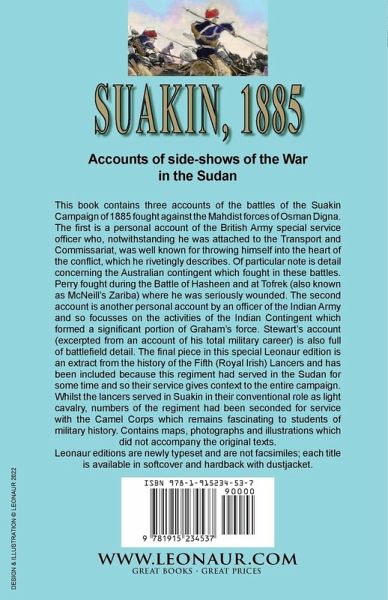 Accounts of side-shows of the War in the Sudan This book contains three accounts of the battles of the Suakin Campaign of 1885 fought against the Mahdist forces of Osman Digna. The first is a personal account of the British Army special service officer who, notwithstanding he was attached to the Transport and Commissariat, was well known for throwing himself into the heart of the conflict, which he rivetingly describes. Of particular note is detail concerning the Australian contingent which fought in these battles. Perry fought during the Battle of Hasheen and at Tofrek (also known as McNeill's Zariba) where he was seriously wounded. The second account is another personal account by an officer of the Indian Army and so focusses on the activities of the Indian Contingent which formed a significant portion of Graham's force. Stewart's account (excerpted from an account of his total military career) is also full of battlefield detail. The final piece in this special Leonaur edition is an extract from the history of the Fifth (Royal Irish) Lancers and has been included because this regiment had served in the Sudan for some time and so their service gives context to the entire campaign. Whilst the lancers served in Suakin in their conventional role as light cavalry, numbers of the regiment had been seconded for service with the Camel Corps which remains fascinating to students of military history. Contains maps, photographs and illustrations which did not accompany the original texts. Leonaur editions are newly typeset and are not facsimiles; each title is available in softcover and hardback with dustjacket.