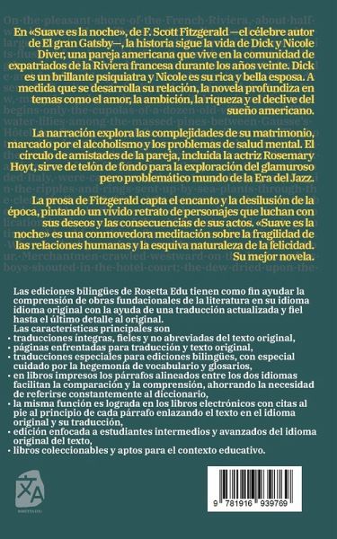 En Suave es la noche, de F. Scott Fitzgerald -el célebre autor de El gran Gatsby-, la historia sigue la vida de Dick y Nicole Diver, una pareja americana que vive en la comunidad de expatriados de la Riviera francesa durante los años veinte. Dick es un brillante psiquiatra y Nicole es su rica y bella esposa. A medida que se desarrolla su relación, la novela profundiza en temas como el amor, la ambición, la riqueza y el declive del sueño americano. La narración explora las complejidades de su matrimonio, marcado por el alcoholismo y los problemas de salud mental. El círculo de amistades de la pareja, incluida la actriz Rosemary Hoyt, sirve de telón de fondo para la exploración del glamuroso pero problemático mundo de la Era del Jazz. La prosa de Fitzgerald capta el encanto y la desilusión de la época, pintando un vívido retrato de personajes que luchan con sus deseos y las consecuencias de sus actos. Suave es la noche es una conmovedora meditación sobre la fragilidad de las relaciones humanas y la esquiva naturaleza de la felicidad. Su mejor novela.