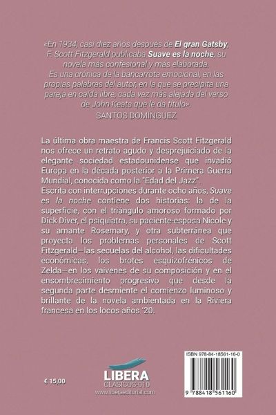 La última obra maestra de Francis Scott Fitzgerald nos ofrece un retrato agudo y desprejuiciado de la elegante sociedad estadounidense que invadió Europa en la década posterior a la Primera Guerra Mundial, conocida como la "Edad del Jazz". Escrita con interrupciones durante ocho años, Suave es la noche contiene dos historias: la de la superficie, con el triángulo amoroso formado por Dick Diver, el psiquiatra, su paciente-esposa Nicole y su amante Rosemary, y otra subterránea que proyecta los problemas personales de Scott Fitzgerald-las secuelas del alcohol, las dificultades económicas, los brotes esquizofrénicos de Zelda-en los vaivenes de su composición y en el ensombrecimiento progresivo que desde la segunda parte desmiente el comienzo luminoso y brillante de la novela ambientada en la Riviera francesa en los locos años '20.