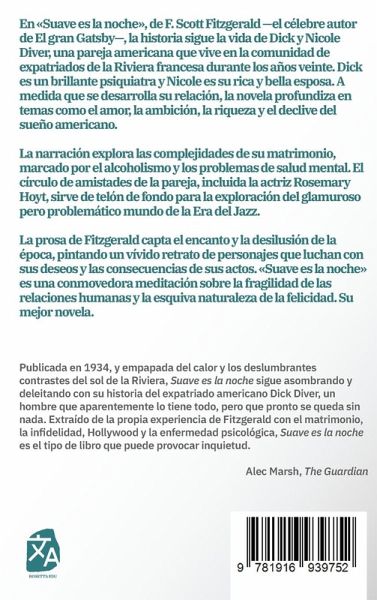 En Suave es la noche, de F. Scott Fitzgerald -el célebre autor de El gran Gatsby-, la historia sigue la vida de Dick y Nicole Diver, una pareja americana que vive en la comunidad de expatriados de la Riviera francesa durante los años veinte. Dick es un brillante psiquiatra y Nicole es su rica y bella esposa. A medida que se desarrolla su relación, la novela profundiza en temas como el amor, la ambición, la riqueza y el declive del sueño americano. La narración explora las complejidades de su matrimonio, marcado por el alcoholismo y los problemas de salud mental. El círculo de amistades de la pareja, incluida la actriz Rosemary Hoyt, sirve de telón de fondo para la exploración del glamuroso pero problemático mundo de la Era del Jazz. La prosa de Fitzgerald capta el encanto y la desilusión de la época, pintando un vívido retrato de personajes que luchan con sus deseos y las consecuencias de sus actos. Suave es la noche es una conmovedora meditación sobre la fragilidad de las relaciones humanas y la esquiva naturaleza de la felicidad. Su mejor novela.
