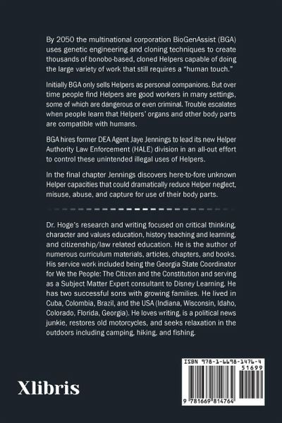 By 2050 the multinational corporation BioGenAssist (BGA) uses genetic engineering and cloning techniques to create thousands of bonobo-based, cloned Helpers capable of doing the large variety of work that still requires a "human touch." Initially BGA only sells Helpers as personal companions. But over time people find Helpers are good workers in many settings, some of which are dangerous or even criminal. Trouble escalates when people learn that Helpers' organs and other body parts are compatible with humans. BGA hires former DEA Agent Jaye Jennings to lead its new Helper Authority Law Enforcement (HALE) division in an all-out effort to control these unintended illegal uses of Helpers. In the final chapter Jennings discovers here-to-fore unknown Helper capacities that could dramatically reduce Helper neglect, misuse, abuse, and capture for use of their body parts.
