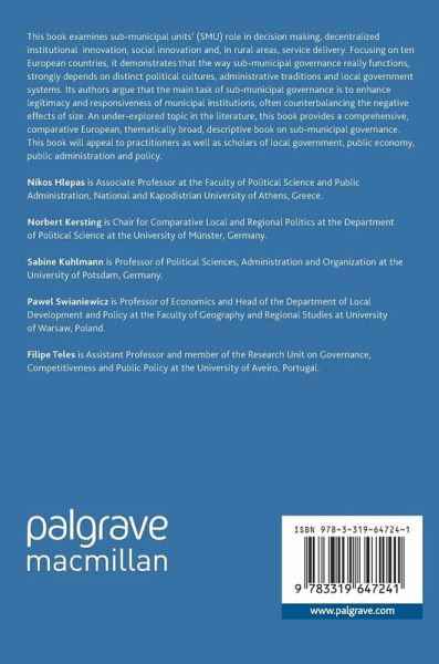 1: Introduction: Decentralization Beyond the Municipal Tier; Nikos Hlepas, Norbert Kersting, Sabine Kuhlmann, Pawel Swianiewicz and Filipe Teles.- 2: Reaching out to sub-municipal decentralization: an ongoing challenge in Belgium; Ellen Wayenberg and Trui Steen.- 3: The "Little Town-Halls" in The Czech Republic: An Unexploited Potential of Functional Decentralization; Jakub Lysek.- 4: Decentralisation, Democratisation and Delivery: English Sub-Municipal Devolution; Colin Copus.- 5: Sub-Municipal Units in Germany: Municipal and Metropolitan Districts; Norbert Kersting and Sabine Kuhlmann.- 6: Between identity politics and the politics of scale: Sub-municipal Governance in Greece; Nikos Hlepas.- 7: Sub-municipal arrangements in Norway: District system in Oslo; Jan Erling Klausen.- 8: New Experiments of Maintenance of Old Traditions? Dual System of Sub-Municipal Units in Poland; Pawel Swianiewicz.- 9: Deeply rooted but still striving for a role: the Portuguese Freguesias under reform; Antonio F. Tavares and Filipe Teles.- 10: Sub-municipal units in Slovenia: Experiences from the past and policy advice for the future; Irena Baclija Brajnik and Roman Lavtar.- 11: Rural and Urban Sub-Municipal Governance in Spain. The contrasting worlds of Lilliput and Brobdingnag; Carmen Navarro and Esther Pano.- 12: Conclusions; Nikos Hlepas, Pawel Swianiewicz and Norbert Kersting.