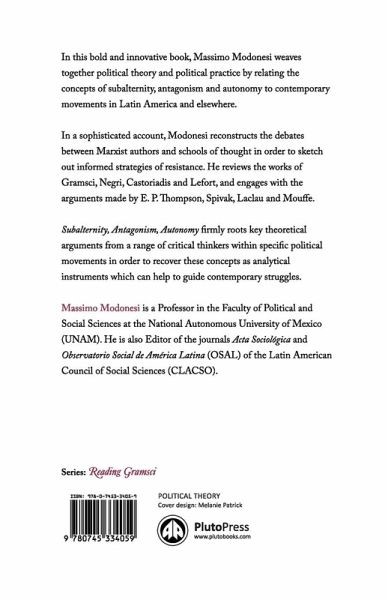 In this bold and innovative book, Massimo Modonesi weaves together theory and political practice by relating the concepts of subalternity, antagonism and autonomy to contemporary movements in Latin America and elsewhere. In a sophisticated account, Modonesi reconstructs the debates between Marxist authors and schools of thought in order to sketch out informed strategies of resistance. He reviews the works of Gramsci, Negri, Castoriadis and Lefort, and engages with the arguments made by E. P. Thompson, Spivak, Laclau and Mouffe. Subalternity, Antagonism, Autonomy firmly roots key theoretical arguments from a range of critical thinkers within specific political movements in order to recover these concepts as analytical instruments which can help to guide contemporary struggles.