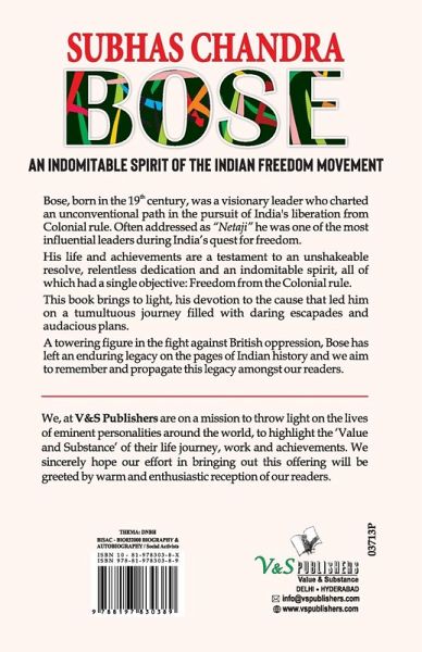 Bose, born in the 19th century, was a visionary leader who charted an unconventional path in the pursuit of India's liberation from Colonial rule. Often addressed as "Netaji" he was one of the most influential leaders during India's quest for freedom. His life and achievements are a testament to an unshakeable resolve, relentless dedication and an indomitable spirit, all of which had a single objective: Freedom from the Colonial rule. This book brings to light, his devotion to the cause that led him on a tumultuous journey filled with daring escapades and audacious plans. A towering figure in the fight against British oppression, Bose has left an enduring legacy on the pages of Indian history and we aim to remember and propagate this legacy amongst our readers. We, at V&S Publishers are on a mission to throw light on the lives of eminent personalities around the world, to highlight the 'Value and Substance' of their life journey, work and achievements. We sincerely hope our effort in bringing out this offering will be greeted by warm and enthusiastic reception of our readers.