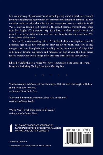 In a wartime Navy of giant carriers and battleships, tiny wooden subchasers did not command much attention. Yet these 110-foot warships, manned mostly by inexperienced reservists, performed vital chores for the fleet everywhere there was action in World War II. They led landing craft right up to the assault beaches, protected them from fire, fought off air attacks, swept for mines, laid down smoke screens, and patrolled the sea for killer submarines. One such doughty little ship, subchaser 692, is the subject of this book. Told by 692's commanding officer Ed Stafford, then a twenty-four-year-old lieutenant (jg) on his first warship, the story follows the thirty-man crew as they scrapped their way through the war, including action during the July 1943 invasion of Sicily. Filled with humor, tension, poignancy, and moments of high drama, this volume leaves today's readers with a vivid image of life on a very small ship in a very big war.