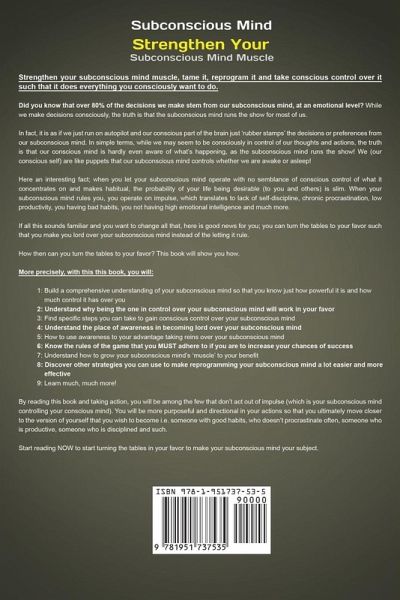 Strengthen your subconscious mind muscle, tame it, reprogram it and take conscious control over it such that it does everything you consciously want to do. Did you know that over 80% of the decisions we make stem from our subconscious mind, at an emotional level? While we make decisions consciously, the truth is that the subconscious mind runs the show for most of us. In fact, it is as if we just run on autopilot and our conscious part of the brain just ‘rubber stamps’ the decisions or preferences from our subconscious mind. In simple terms, while we may seem to be consciously in control of our thoughts and actions, the truth is that our conscious mind is hardly even aware of what’s happening, as the subconscious mind runs the show! We (our conscious self) are like puppets that our subconscious mind controls whether we are awake or asleep! Here an interesting fact; when you let your subconscious mind operate with no semblance of conscious control of what it concentrates on and makes habitual, the probability of your life being desirable (to you and others) is slim. When your subconscious mind rules you, you operate on impulse, which translates to lack of self-discipline, chronic procrastination, low productivity, you having bad habits, you not having high emotional intelligence and much more. If all this sounds familiar and you want to change all that, here is good news for you; you can turn the tables to your favor such that you make you lord over your subconscious mind instead of the letting it rule. How then can you turn the tables to your favor? This book will show you how.