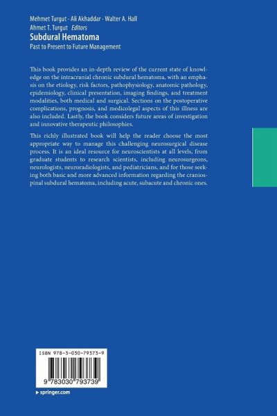 Chapter 1) Review of Craniospinal Acute, Subacute and Chronic Subdural Hematomas.- Chapter 2) Cranial Acute and Subacute Subdural Hematomas.- Chapter 3) History of Cranial Subdural Hematoma.- Chapter 4) Understanding Chronic Subdural Hematoma: Pathophysiology.- Chapter 5) Experimental Models of Chronic Subdural Hematoma.- Chapter 6) Role of Cranial Vault Morphology on the Location of Chronic Subdural Hematoma.- Chapter 7) Anatomopathology and Histopathologic Changes in Chronic Subdural Hematoma.- Chapter 8) Epidemiology and Predisposing Factors of CSDH.- Chapter 9) Main Clinical Presentations of Chronic Subdural Hematomas.- Chapter 10) Seizures in Chronic Subdural Hematoma (cSDH).- Chapter 11) Chronic Subdural Hematoma with Psychiatric Disorders.- Chapter 12) Chronic Subdural Hematoma in the Pediatric Population.- Chapter 13) Imaging in Chronic Subdural Hematoma.- Chapter 14) Organized Chronic Subdural Hematoma.- Chapter 15) Calcified or Ossified Chronic Subdural Hematoma.- Chapter 16) Cranial Chronic Subdural Hematoma Following Traumatic Subdural Hygroma.- Chapter 17) Subdural Hemorrhage Secondary to CSF Shunting and Endoscopic Neurosurgery.- Chapter 18) Chronic Subdural Hematoma Following Lumbar Puncture and Spinal Anesthesia.- Chapter 19) Intracranial Hypotension.- Chapter 20) Chronic Subdural Hematoma Following Electroconvulsive Therapy: A Rare But Serious Complication.- Chapter 21) Chronic Subdural Hematoma Caused by Hematological Diseases.- Chapter 22) Acute and Chronic Subdural Hematoma Related to Intracranial Vascular Malformations.- Chapter 23) CSDH and Intracranial Arachnoid Cysts.- Chapter 24) Rare Intracranial Locations of Chronic Subdural Hematoma.- Chapter 25) CSDH Related to Sport Head Injury.- Chapter 26) Neuroimaging Differential Diagnosis (Imaging Mimicking Conditions) of Cranial Chronic Subdural Hematoma.- Chapter 27) Nonsurgical Treatment of CSDH.- Chapter 28) Anesthesia for Chronic Subdural Hematoma.- Chapter 29) Surgical Treatment of Chronic Subdural Hematoma.- Chapter 30) Role of Endoscopy in Surgical Treatment of Chronic Subdural Hematoma (cSDH).- Chapter 31) Middle Meningeal Artery Embolization for Chronic Subdural Hematomas.- Chapter 32) Perioperative Medical Management of Chronic Subdural Hematoma.- Chapter 33) Postoperative Complications of CSDH.- Chapter 34) Postoperative Management and Follow-up Strategies for CSDH.- Chapter 35) Corticosteroid Therapy for Chronic Subdural Hematomas.- Chapter 36) Management of Recurrence of Chronic Subdural Hematoma.- Chapter 37) Rehabilitation for CSDH in the Elderly.- Chapter 38) Outcome and Prognosis of Chronic Subdural Hematoma.- Chapter 39) Medicolegal Aspects of Subdural Hematoma.- Chapter 40) Spinal Subdural Hematomas.