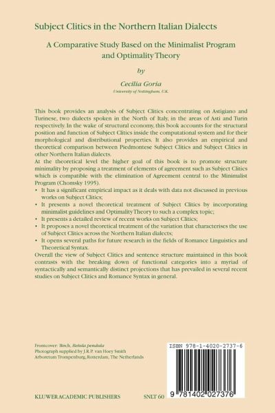 1 Introduction.- 1.0 Introduction.- 2.0 The Dialect.- 3.0 The object of inquiry.- 4.0 Objectives and proposals.- 5.0 Theoretical background.- 5.1 The Minimalist Program.- 5.2 Optimality Theory.- 6.0 This study: questions and answers.- 6.1 What is the empirical and theoretical significance of working with SCLs in Piedmontese?.- 6.2 Why is a twofold approach adopted and what are the benefits of this choice?.- 6.3 What are the boundaries of each approach in the analysis proposed in this book?.- 7.0 The Data.- 8.0 Organisation.- Notes.- 2 The Data.- 1.0 Introduction.- 2.0 Turinese.- 2.1 Turinese SCLs and types of subjects and verbs.- 2.2 Linear order between SCLs and other proclitics.- 2.3 SCLs and negative markers.- 2.4 Direct interrogatives.- 2.5 SCLs in subordinate clauses.- 2.6 SCLs in coordinated clauses.- 2.7 SCL: Non-finite forms and true imperatives.- 2.8 Optionality.- 3.0 Astigiano.- Notes.- 3 Optimal Agreement The position and the function of SCLs.- 1.0 Introduction.- 2.0 The proposal.- 3.0 Pre verbal subjects.- 3.1 Arguments against the left dislocation analysis of unmarked preverbal subjects in Italian and the NIDs.- 3.2 Subject-in-CP analysis (Poletto 2000b).- 3.3 Subject positions below the CP boundary: more evidence for SCLs in T.- 4.0 The Extended Projection Principle.- 4.1 SCLs and the EPP.- 5.0 A multi-layered model for SCLs: an overview.- 5.1 Four types of SCLs: an outline of Poletto's Agreement Field.- 5.2 The Agreement Field.- 5.3 Reviewing the Agreement Field: Turinese and Astigiano.- 6.0 Conclusion.- Notes.- Chapter4 Optimal Agreement The morphology and the distribution of SCLs.- 1.0 Introduction.- 2.0 Optimal Agreement.- 3.0 The feature specification of Piedmontese SCLs.- 3.1 The Basic System and the Deictic Systems.- 3.2 Full and PersonOptionality.- 3.3 SCLs in coordination.- 4.0 Summary and conclusion.- Notes.- 5 Beyond Piedmontese.- 1.0 Introduction.- 2.0 Beyond Piedmontese and the minimalist component of Optimal Agreement.- 2.1 Negation.- 3.0 A common property across the NIDs and SCL types.- 3.1 Imperatives.- 3.2 Non-finite verb forms.- 4.0 Beyond Piedmontese and the OT component of Optimal Agreement.- 4.1 Renzi and Vanelli's (1983) SCL Systems and Florentine.- 5.0 Illegitimate candidates.- 5.1 Candidates that do not encode [±add,sg].- 5.2 Two feature combination constraints.- 5.3 An alternative analysis: [?] Dominance Scale.- 6.0 Conclusion.- Notes.- 6 Beyond SCLs: Piedmontese interrogatives.- 1.0 Introduction.- 2.0 Interrogative inversion and ICLs.- 2.1 ICLs as interrogative morphology.- 2.2 Agreement constraints and ICLs.- 3.0 A unitary account of Piedmontese interrogation strategies.- 3.1 Wh+che questions.- 3.2 Theproposal.- 4.0 Summary.- 5.0 Interrogativity and the Agreement Field (Poletto 2000b).- 5.1 Piedmontese.- 6.0 Conclusion.- Notes.- 7 Concluding remarks.- 1.0 A summary of Optimal Agreement and its achievements.- 2.0 Contribution to structure-minimality.- 3.0 Structure-minimality vs. amyriad of projections.- 4.0 Topics for future study.- 4.1 A gradual notion of Finiteness: what do SCLs teil us?.- 4.2 OT in narrow syntax.- Notes.- References.
