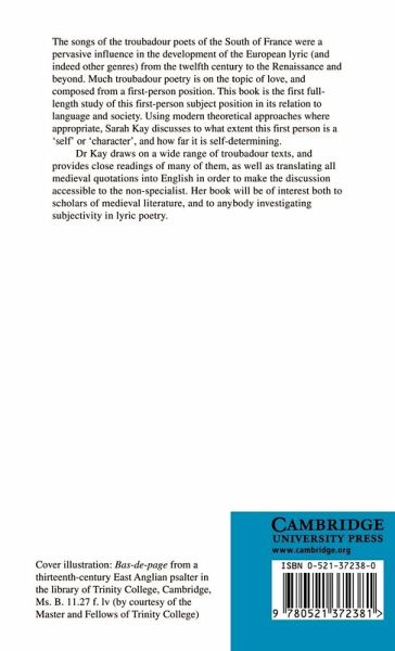 The songs of the troubadour poets of the South of France were a pervasive influence in the development of the European lyric (and indeed other genres) from the twelfth century to the Renaissance and beyond. Much troubadour poetry is on the topic of love, and is composed from a first-person position. This book is the first full-length study of this first-person subject position in its relation to language and society. Using modern theoretical approaches where appropriate, Sarah Kay discusses to what extent this first person is a 'self' or 'character', and how far it is self-determining. Dr Kay draws on a wide range of troubadour texts, and provides close readings of many of them, as well as translating all medieval quotations into English in order to make the discussion accessible to the non-specialist. Her book will be of interest both to scholars of medieval literature, and to anybody investigating subjectivity in lyric poetry.