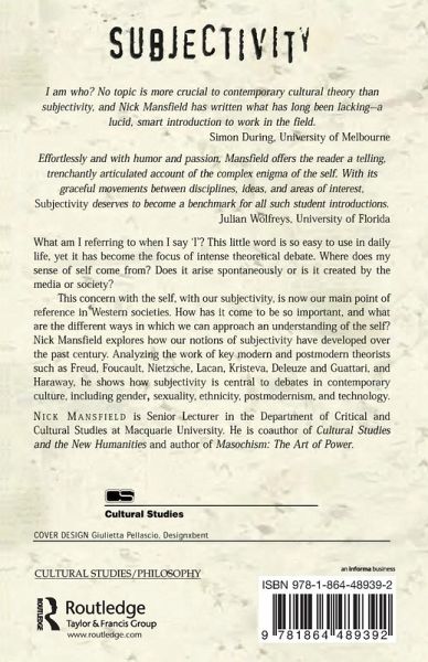 Nick Mansfield explores how our understanding of our subjectivity has developed over the past century. He looks at the work of key modern and postmodern theorists, including Freud, Foucault, Nietzsche, Lacan, Kristeva, Deleuze and Guattari, and he shows how subjectivity is central to debates in contemporary culture, including gender, sexuality, ethnicity, postmodernism and technology.