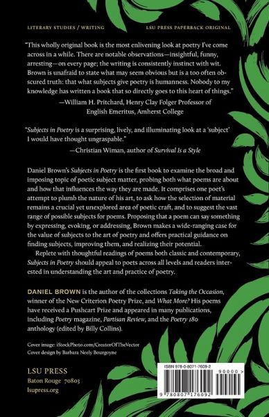 Daniel Brown's Subjects in Poetry is the first book to examine the broad and imposing topic of poetic subject matter, probing both what poems are about and how that influences the way they're made. It comprises one poet's attempt to plumb the nature of his art, to ask how the selection of material remains a crucial yet unexplored area of poetic craft, and to suggest the vast range of possible subjects for poems. The book begins by venturing a novel definition of "subject," derived from Robert Frost's dictum that poetry constitutes an "art of having something to say." Brown posits that a poem can say something by expressing, evoking, or addressing. He considers each of these ways-of-saying in turn, first defining it and then looking at poems in which it predominates. Brown next makes a wide-ranging case for the value of subjects to poems, poets, and the art of poetry, especially at a time when many poems appear subjectless. He concludes the book with practical guidance on finding subjects, improving them, and realizing their potential. Replete with thoughtful readings of poems both classic and contemporary, Subjects in Poetry should appeal to poets across all levels and readers interested in understanding the art and practice of poetry.