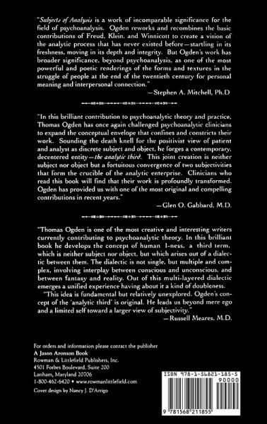 Subjects of Analysis is a work of incomparable significance for the field of psychoanalysis. Ogden reworks and recombines the basic contributions of Freud, Klein, and Winnicott to create a vision of the analytic process that has never existed before-startling in its freshness, moving in its depth and integrity.