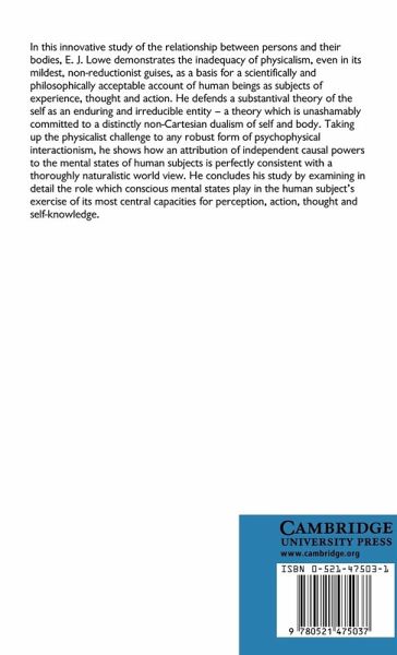 In this innovative study of the relationship between persons and their bodies, E. J. Lowe demonstrates the inadequacy of physicalism, even in its mildest, non-reductionist guises, as a basis for a scientifically and philosophically acceptable account of human beings as subjects of experience, thought and action. He defends a substantival theory of the self as an enduring and irreducible entity - a theory which is unashamedly committed to a distinctly non-Cartesian dualism of self and body. Taking up the physicalist challenge to any robust form of psychophysical interactionism, he shows how an attribution of independent causal powers to the mental states of human subjects is perfectly consistent with a thoroughly naturalistic world view. He concludes his study by examining in detail the role which conscious mental states play in the human subject's exercise of its most central capacities for perception, action, thought and self-knowledge.