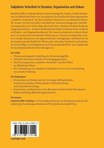 Katharina Miko-Schefzig stellt die wissenssoziologische Analyse sozialer Situationen im öffentlichen Raum vor. Sie analysiert den Einfluss des Deutungsmusters "subjektive Sicherheit" auf die konkreten Situationen im städtischen Raum. Ihr Ansatz verortet sich dabei innerhalb der wissenssoziologischen Subjektivierungsanalyse, der Fokus liegt jedoch auf einer stärkeren Einbeziehung der Organisationsebene - konkret am Beispiel der Polizei. In diesem Sinne verbindet sie Diskurs- mit Organisationstheorie. Die Autorin präsentiert in diesem Buch auch ein konkretes methodisches Werkzeug zur wissenssoziologischen Analyse sozialer Situationen: die vignettenbasierte Fokusgruppe. Sicherheit ist ein dominantes gesellschaftliches Thema, das unter dem Eindruck wiederholter Terroranschläge in und Migration nach Europa oftmals Dreh- und Angelpunkt für demokratiepolitische Entwicklungen ist.