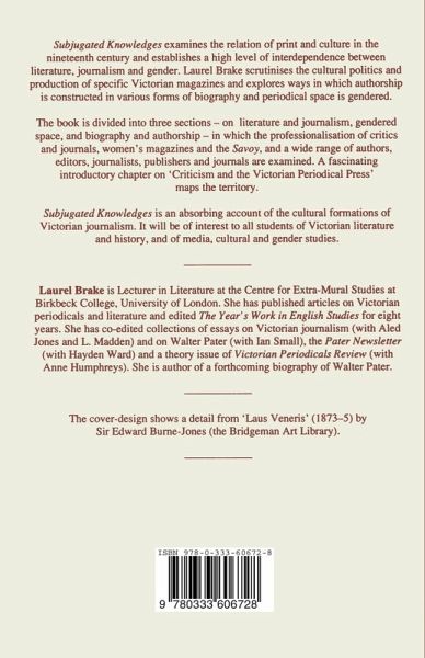 LAUREL BRAKE is Reader in Literature and Print Culture at Birkbeck College, She is the author of Subjugated Knowledges (1994) and Walter Pater (1994), and has co-edited Investigating Victorian Journalism (1990), Pater in the 1990s (1991) and The Endings of Epochs (1995). She has published articles and reviews on nineteenth-century literature, publishing and cultural theory.