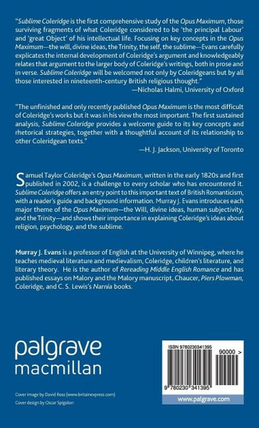 'Sublime Coleridge is the first comprehensive study of the Opus Maximum, those surviving fragments of what Coleridge considered to be 'the principal Labour' and 'great Object' of his intellectual life. Focusing on key concepts in the Opus Maximum the will, divine ideas, the Trinity, the self, the sublime Evans carefully explicates the internal development of Coleridge's argument and knowledgeably relates that argument to the larger body of Coleridge's writings, both in prose and in verse. Sublime Coleridge will be welcomed not only by Coleridgeans but by all those interested in nineteenth-century British religious thought.' - Nicholas Halmi, University of Oxford