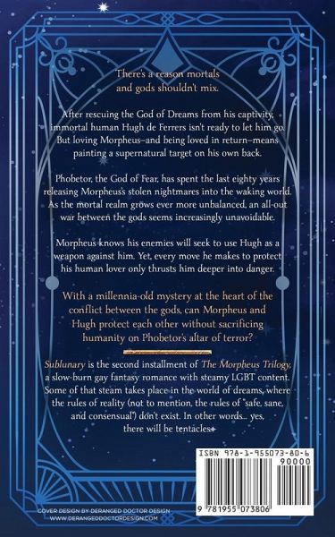 There's a reason mortals and gods shouldn't mix. After rescuing the God of Dreams from his captivity, immortal human Hugh de Ferrers isn't ready to let him go. But loving Morpheus-and being loved in return-means painting a supernatural target on his own back. Phobetor, the God of Fear, has spent the last eighty years releasing Morpheus's stolen nightmares into the waking world. As the mortal realm grows ever more unbalanced, an all-out war between the gods seems increasingly unavoidable. Morpheus knows his enemies will seek to use Hugh as a weapon against him. Yet, every move he makes to protect his human lover only thrusts him deeper into danger. With a millennia-old mystery at the heart of the conflict between the gods, can Morpheus and Hugh protect each other without sacrificing humanity on Phobetor's altar of terror? -o-o-o- Sublunary is the second installment of The Morpheus Trilogy, a slow-burn gay fantasy romance with steamy LGBT content. Some of that steam takes place in the world of dreams, where the rules of reality don't exist. In other words... yes, there will be tentacles.
