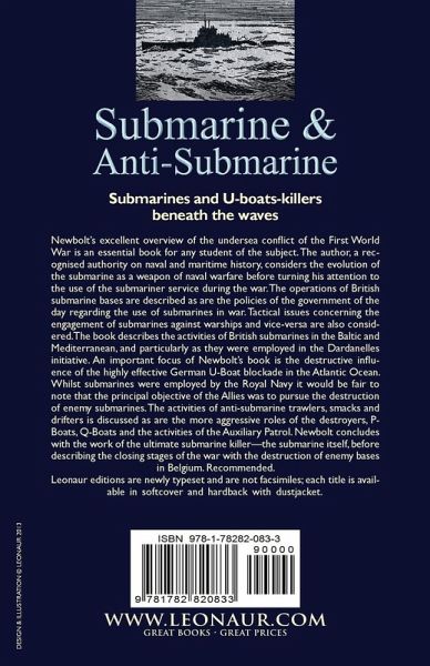 Submarines and U-boats-killers beneath the waves Newbolt's excellent overview of the undersea conflict of the First World War is an essential book for any student of the subject. The author, a recognised authority on naval and maritime history, considers the evolution of the submarine as a weapon of naval warfare before turning his attention to the use of the submariner service during the war. The operations of British submarine bases are described as are the policies of the government of the day regarding the use of submarines in war. Tactical issues concerning the engagement of submarines against warships and vice-versa are also considered. The book describes the activities of British submarines in the Baltic and Mediterranean, and particularly as they were employed in the Dardanelles initiative. An important focus of Newbolt's book is the destructive influence of the highly effective German U-Boat blockade in the Atlantic Ocean. Whilst submarines were employed by the Royal Navy it would be fair to note that the principal objective of the Allies was to pursue the destruction of enemy submarines. The activities of anti-submarine trawlers, smacks and drifters is discussed as are the more aggressive roles of the destroyers, P-Boats, Q-Boats and the activities of the Auxiliary Patrol. Newbolt concludes with the work of the ultimate submarine killer-the submarine itself, before describing the closing stages of the war with the destruction of enemy bases in Belgium. Recommended. Leonaur editions are newly typeset and are not facsimiles; each title is available in softcover and hardback with dustjacket.
