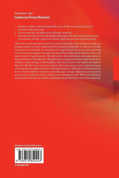 This book covers the latest research on porous materials at the submicron scale and inspires readers to better understand the porosity of materials, as well as to develop innovative new materials. A comprehensive range of materials are covered, including carbon-based and organic-based porous materials, porous anodic alumina, silica, and titania-based sol-gel materials. The fabrication, characterization, and applications of these materials are all explored, with applications ranging from sensors, thermoelectrics, catalysis, energy storage, to photovoltaics. Also of practical use for readers are chapters that describe the basics of porous silicon fabrication and its use in optical sensing and drug delivery applications; how thermal transport is affected in porous materials; how to model diffusion in porous materials; and a unique chapter on an innovative spectroscopic technique used to characterize materials' porosity. This is an ideal book for graduate students, researchers, and professionals who work with porous materials.
