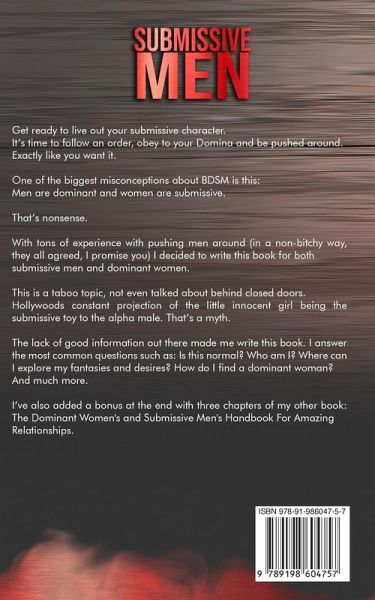 Are you craving for a Mistress in your life? Plenty of women out there have a burning desire to dominate men. They want to be the Mistress in charge, and they want it NOW. Unfortunately, most men don't know where to find them and how to spot them. And even if they might be lucky and run into a potential Mistress, they get needy and screw it up. If that sounds familiar, here's your solution. In Submissive Men, you will learn:how to find your free Mistress (including detailed online dating advice) how to set healthy boundaries for you and your Mistress how to communicate your needs how to explore all your desires as a submissive man and much more! Are you ready to start serving your Mistress?