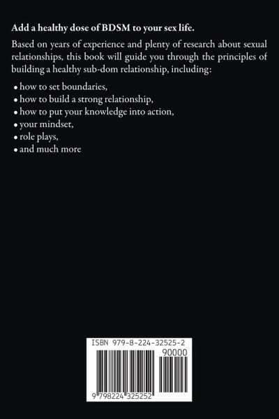 Add a healthy dose of BDSM to your sex life. Based on years of experience and plenty of research about sexual relationships, this book will guide you through the principles of building a healthy sub-dom relationship, including: * how to set boundaries, * how to build a strong relationship, * how to put your knowledge into action, * your mindset, * role plays, * and much more