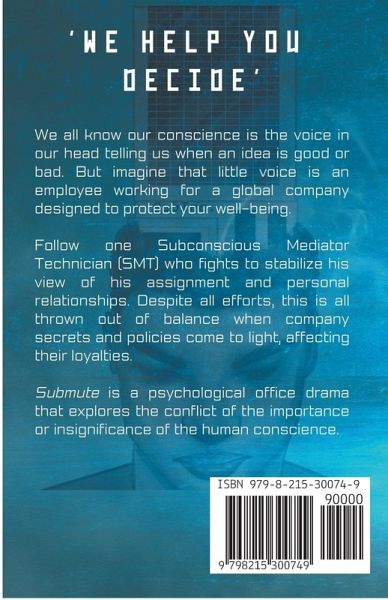 We all know our conscience is the voice in our head telling us when an idea is good or bad. But imagine that little voice is an employee working for a global company designed to protect your well-being. 'We help you decide.' Follow one Subconscious Mediator Technician (SMT) who fights to stabilize his view of his assignment and personal relationships. Despite all efforts, this is all thrown out of balance when company secrets and policies come to light, affecting their loyalties. SUBMUTE is a psychological office drama that explores the conflict of the importance or insignificance of the human conscience. Have you wanted to see the perspective of your conscience? SUBMUTE is a unique novella that does just that. Follow the story of Thomas Evans, who provides influence to protect his assignment and abides by the rules of the company, Sub Inc. He works hard to maintain his friendships, a budding romance, and office bullies. What happens when his influence is ignored, Sub Inc's rule of conduct changes and his friends disappear? Grab your copy of the first book of the Sub Inc Series: Submute, today! Ebook and print versions are available.
