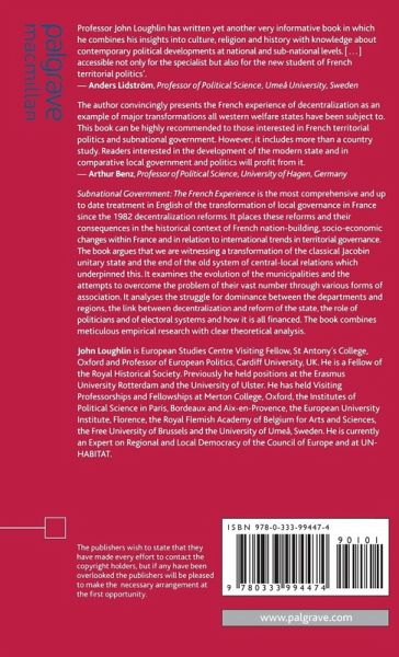 'John Loughlin makes a rigorous and clear contribution to understanding French territorial governance. As an expert comparativist, the author has complete mastery of his chosen subject, France, and brilliantly juggles the areas of political systems, regions and political traditions.' - Romain Pasquier, Revue Francaise de Science Politique