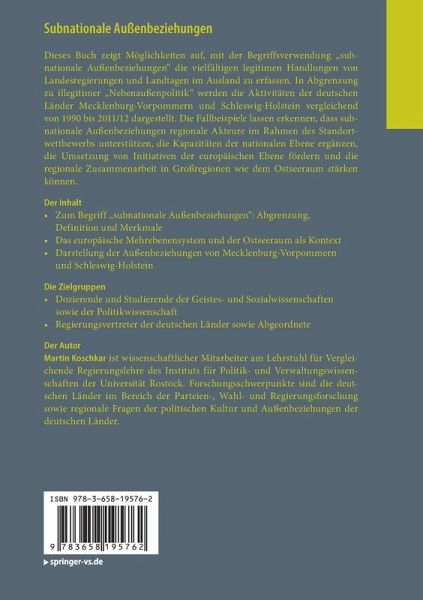 Dieses Buch zeigt Möglichkeiten auf, mit der Begriffsverwendung "subnationale Außenbeziehungen" die vielfältigen legitimen Handlungen von Landesregierungen und Landtagen im Ausland zu erfassen. In Abgrenzung zu illegitimer "Nebenaußenpolitik" werden die Aktivitäten der deutschen Länder Mecklenburg-Vorpommern und Schleswig-Holstein vergleichend von 1990 bis 2011/12 dargestellt. Die Fallbeispiele lassen erkennen, dass subnationale Außenbeziehungen regionale Akteure im Rahmen des Standortwettbewerbs unterstützen, die Kapazitäten der nationalen Ebene ergänzen, die Umsetzung von Initiativen der europäischen Ebene fördern und die regionale Zusammenarbeit in Großregionen wie dem Ostseeraum stärken können.