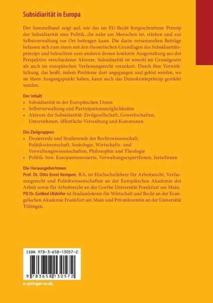 Der Sammelband zeigt auf, wie das im EU-Recht festgeschriebene Prinzip der Subsidiarität eine Politik, die nahe am Menschen ist, stärken und zur Selbstverwaltung vor Ort beitragen kann. Die darin versammelten Beiträge befassen sich zum einen mit den theoretischen Grundlagen des Subsidiaritätsprinzips und beleuchten zum anderen dessen konkrete Ausgestaltung aus der Perspektive verschiedener Akteure. Subsidiarität ist sowohl im Grundgesetz als auch im europäischen Verfassungsrecht verankert. Durch ihre Verwirklichung, das heißt, indem Probleme dort angegangen und gelöst werden, wo sie ihren Ausgangspunkt haben, kann auch das Demokratieprinzip gestärkt werden.