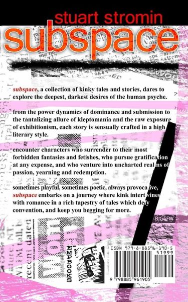 subpace, a collection of kinky tales and stories, dares to explore the deepest, darkest desires of the human psyche. from the power dynamics of dominance and submission to the tantalizing allure of kleptomania and the raw exposure of exhibitionism, each story is sensually crafted in a high literary style. encounter characters who surrender to their most forbidden fantasies and fetishes, who pursue gratification at any expense, and who venture into uncharted realms of passion, yearning, and redemption. sometimes playful, sometimes poetic, always provocative, subspace embarks on a journey where kink intertwines with romance in a rich tapestry of tales which defy convention, and keep you begging for more.