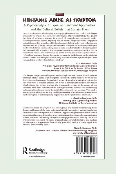 What can psychoanalysis contribute to an understanding of the etiology, treatment, and prevention of substance abuse? Here, Louis Berger contests both the orthodox view of substance abuse as a "disease" explicable within the medical model, and the fashionable dissenting view that substance abuse is a habit controllable through the "willpower" fostered by superficial treatment approaches. According to Berger, substance abuse is first and foremost a symptom. He argues that it is only by grasping this fact that we can understand why standard approaches to treatment and prevention have failed. Berger invokes a wide spectrum of recent analytic insights about infant and child development, the psychology of narcissism, and primitive character disorders in making the case that substance abuse masks serious preoedipal (or "midrange") psychopathology. Such psychopathology, operating at both cultural and person levels, explains why certain individuals become dependent on illicit drugs; it is equally revelatory of why the substance abuse "establishment" -- and society at large -- continues to misconstrue the nature of the problem and to proffer ill-conceived and ineffective remedies. After thoroughly examining the motives, conscious and unconscious, that maintain "mainstream" myths about substance abuse, Berger points the way to alternative approaches to prevention and treatment.