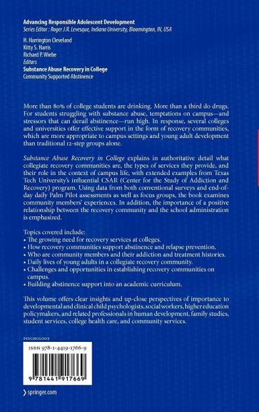 Substance Abuse Recovery in College explains in authoritative detail what collegiate recovery communities are, the types of services they provide, and their role in the context of campus life, with extended examples from Texas Tech University's influential CSAR (Center for the Study of Addiction and Recovery) program. Using data from both conventional surveys and end-of-day daily Palm Pilot assessments as well as focus groups, the book examines community members' experiences. In addition, the importance of a positive relationship between the recovery community and the school administration is emphasized.