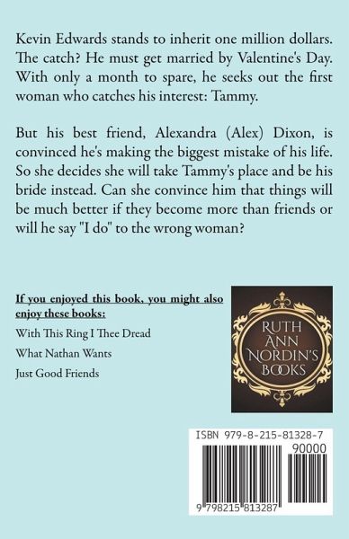 Kevin Edwards stands to inherit one million dollars. The catch? He must get married by Valentine's Day. With only a month to spare, he seeks out the first woman who catches his interest: Tammy. But his best friend, Alexandra (Alex) Dixon, is convinced he's making the biggest mistake of his life. So she decides she will take Tammy's place and be his bride instead. Can she convince him that things will be much better if they become more than friends or will he say "I do" to the wrong woman?