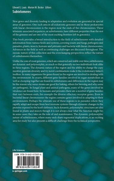 This book provides a broad introduction to the field of subtelomeres with detailed information from various fields and systems, covering yeasts and fungi, pathogens and parasites, plants, insects, humans and primates and bacteria with linear chromosomes. Advances in the field as well as continuing challenges are discussed throughout. The mosaic nature of this collection and the everchanging perspectives reflect the nature of subtelomeres themselves.