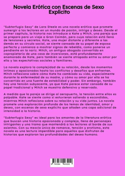 "Subterfugio Sexy" de Lara Steele es una novela erótica que promete sumergir a los lectores en un mundo de pasión, intriga y deseo. Desde el primer capítulo, la historia nos introduce a Kate y Mitch, una pareja que se prepara para un viaje a Gran Caimán, pero cuya relación está llena de tensiones y secretos. Kate, una mujer distante y diferente a las demás en su círculo social, se siente cansada de su papel de esposa perfecta y comienza a mostrar signos de rebeldía, como ponerse un pendiente en la nariz. Mitch, un antiguo abogado convertido en copropietario de una casa de inversiones, está profundamente enamorado de Kate, pero también se siente atrapado entre su amor por ella y las expectativas sociales y familiares.La novela explora la complejidad de su relación, desde los momentos íntimos y apasionados hasta los conflictos y desafíos que enfrentan. Mitch reflexiona sobre cómo Kate ha cambiado su vida, especialmente durante la enfermedad de su madre, y cómo su amor por ella se ha convertido en una fuente de estabilidad y poder. Sin embargo, también hay una tensión subyacente, ya que Kate parece estar cansada de su papel tradicional y Mitch se muestra defensivo y reservado.A medida que la pareja se dirige al aeropuerto, la tensión entre ellos es palpable. Kate se siente como si estuvieran saliendo a escondidas, mientras Mitch reflexiona sobre su relación y su vida juntos. La novela promete una exploración profunda de los temas de identidad, amor y deseo, con escenas de sexo explícito que añaden una capa adicional de intensidad a la historia."Subterfugio Sexy" es ideal para los amantes de la literatura erótica que buscan una historia apasionada y compleja, llena de personajes intrigantes y una trama que mantendrá a los lectores al borde de sus asientos. Con su mezcla única de romance, tensión y erotismo, esta novela es una lectura imperdible para aquellos que disfrutan de historias que exploran las profundidades del deseo humano.