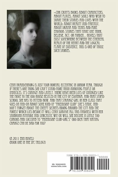 Cera Brandenburg is just your normal eccentric in junior year, though if there's one thing she can't stand more than annoying people or imbeciles, it's change! And lately, thee have been lots of changes! Like the move to the odd house nestled in the city of Esoteria, and that stupid school she has to attend now, and that strange girl in her class that goes on and on about some kind of "Friendship Club" she's made. And don't forget about the creepy secrets hiding around the city and the forest which slumbers beside it! Will Cera survive all this madness with her stubborn attitude and sarcastic wit, or will she become a little too curious and succumb to "Friendship Club Girl's" odd idea that hating change can actually be bad for you? ~CRK's debut novel and book one of the series of the same name