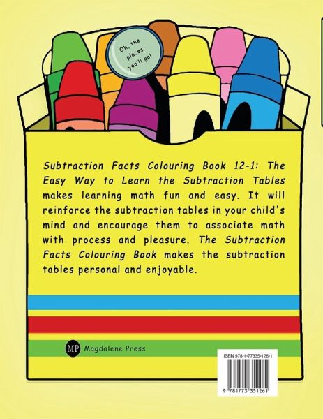 Subtraction Facts Colouring Book 1-12: The Easy Way to Learn the Subtraction Tables makes learning math fun and easy. It will reinforce the subtraction facts in your child's mind and encourage them to associate subtraction with process and pleasure. The Subtraction Facts Colouring Book makes learning the subtraction tables personal and enjoyable. #70 Quality interior paper for crayon, colour pencil and marker use.
