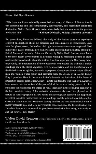 For generations, historians believed that the study of the African-American experience centered on the questions about the processes and consequences of enslavement. Even after this phase passed, the modern Civil Rights Movement took center stage and filled hundreds of pages, creating a new framework for understanding both the history of the United States and of the world. Suburban Erasure by Walter David Greason contributes to the most recent developments in historical writing by recovering dozens of previously undiscovered works about the African-American experience in New Jersey. More importantly, his interpretation of these documents complicates the traditional understandings about the Great Migration, civil rights activism, and the transformation of the United States as a global, economic superpower. Greason details the voices of black men and women whose vision and sacrifices made the dream of Dr. Martin Luther King, Jr. possible. Then, in the second half of this study, the limitations of this dream of integration become clear as New Jersey-a state that took the lead in showing American how to overcome the racism of the past-fell victim to a recurring pattern of colorblindness that entrenched the legacy of racial inequality in the consumer economy of the late twentieth century. Suburbanization simultaneously erased the physical architecture of rural segregation in New Jersey and ideologically obscured the deepening, persistent injustices that became the War on Drugs and the prison-industrial complex. His solution for the twenty-first century involves the most fundamental effort to racially integrate state and local government conceived since the Reconstruction Era. Suburban Erasure is a must read for people concerned with democracy, human rights, and the future of civil society.