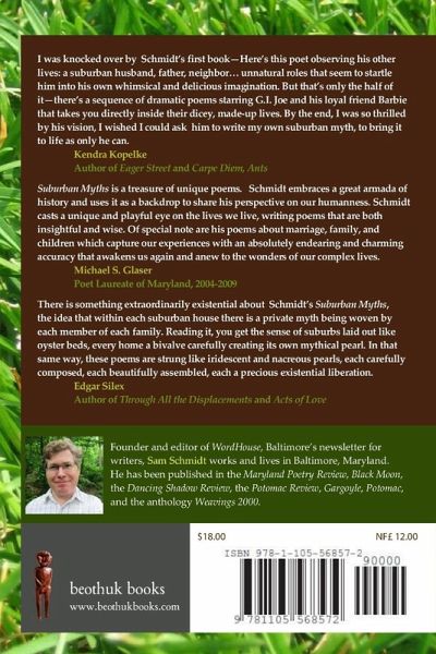 In Suburban Myths, Sam Schmidt writes poetry that plumbs the depths of everyday life in that most artificial of environments, the American suburb. He explores not only the myth that is the suburb-an island in time and space trying to forestall nature and history while also being part of them, and the myths of romantic love and family life by which the suburbs call to something in our hearts-but also the sometimes-whimsical myths that we create to try to make the suburban world come round at those times when it suddenly seems foreign.