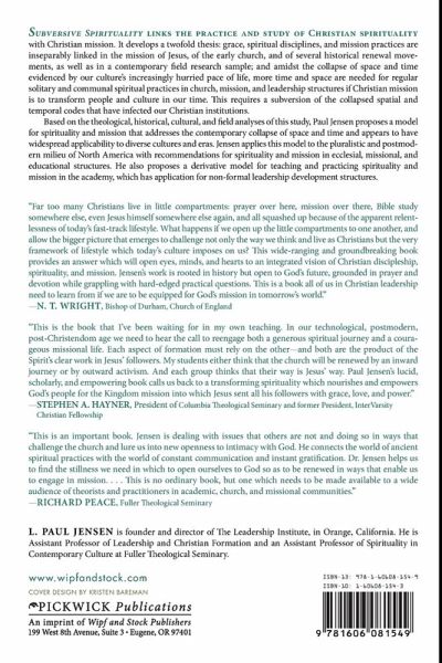Subversive Spirituality links the practice and study of Christian spirituality with Christian mission. It develops a twofold thesis: grace, spiritual disciplines, and mission practices are inseparably linked in the mission of Jesus, of the early church, and of several historical renewal movements, as well as in a contemporary field research sample; and amidst the collapse of space and time evidenced by our culture's increasingly hurried pace of life, more time and space are needed for regular solitary and communal spiritual practices in church, mission, and leadership structures if Christian mission is to transform people and culture in our time. This requires a subversion of the collapsed spatial and temporal codes that have infected our Christian institutions. Jensen employs methods and approaches from a variety of academic disciplines to explore both spirituality in terms of space and time and mission in terms of deed and word. Specifically, Jensen examines the spirituality and mission of Jesus, the early church, the apostolic fathers, Origen, the Devotio Moderna, the early Jesuits, David Brainerd, and several women in 19th century Protestant missions. He considers the spirituality and mission that have arisen within the postmodern generations born after 1960. Based on the theological, historical, cultural, and field analyses of this study, a model for spirituality and mission is proposed. The model addresses the contemporary collapse of space and time and appears to have widespread applicability to diverse cultures and eras. Jensen's model is applied to the pluralistic and postmodern milieu of North America with recommendations for spirituality and mission in church, mission, and educational structures. A derivative model for teaching and practicing spirituality and mission in the academy, which also has application for non-formal leadership development structures, is also proposed.
