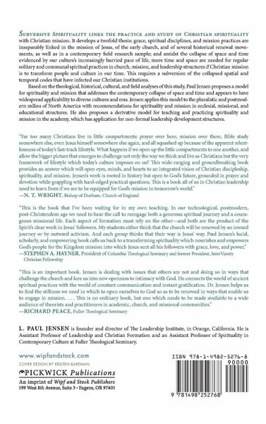 Subversive Spirituality links the practice and study of Christian spirituality with Christian mission. It develops a twofold thesis: grace, spiritual disciplines, and mission practices are inseparably linked in the mission of Jesus, of the early church, and of several historical renewal movements, as well as in a contemporary field research sample; and amidst the collapse of space and time evidenced by our culture's increasingly hurried pace of life, more time and space are needed for regular solitary and communal spiritual practices in church, mission, and leadership structures if Christian mission is to transform people and culture in our time. This requires a subversion of the collapsed spatial and temporal codes that have infected our Christian institutions. Jensen employs methods and approaches from a variety of academic disciplines to explore both spirituality in terms of space and time and mission in terms of deed and word. Specifically, Jensen examines the spirituality and mission of Jesus, the early church, the apostolic fathers, Origen, the Devotio Moderna, the early Jesuits, David Brainerd, and several women in 19th century Protestant missions. He considers the spirituality and mission that have arisen within the postmodern generations born after 1960. Based on the theological, historical, cultural, and field analyses of this study, a model for spirituality and mission is proposed. The model addresses the contemporary collapse of space and time and appears to have widespread applicability to diverse cultures and eras. Jensen's model is applied to the pluralistic and postmodern milieu of North America with recommendations for spirituality and mission in church, mission, and educational structures. A derivative model for teaching and practicing spirituality and mission in the academy, which also has application for non-formal leadership development structures, is also proposed.
