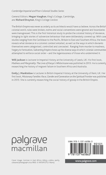 Table of Contents 1. Introduction: Thinking With Deviance; Will Jackson and Emily Manktelow 2. From Pawns to Players: Rewriting the Lives of Three Indigenous Go-Betweens; Kate Fullagar 3. 'Washing the Blackmoor White': Interracial Intimacy and Coloured Women's Agency in Jamaica; Meleisa Ono-George 4. 'The starched boundaries of civilization': sympathetic allegiance and the subversive politics of affect in colonial India; Andrew J. May 5. 'Base and Wicked Characters': European Island Dwellers in the Western Pacific, 1788 - 1850 ; Malcolm Campbell 6. Thinking With Gossip: Deviance, Rumour And Reputation In The South Seas Mission Of The London Missionary Society; Emily J. Manktelow 7. Producing And Managing Deviance In The Disabled Colonial Self: John Kitto, The Deaf Traveller; Esme Cleall 8. Exporting and Repatriating the Colonial Insane: New Zealand before the First World War; Angela McCarthy 10. Not Seeking Certain Proof: Interracial Sex And Archival Haze In High-Imperial Natal; Will Jackson 11. Devious Documents: Corruption and Paperwork in Colonial Burma c.1900; Jonathan Saha 12. Empire and Sexual Deviance: Debating White Woman's Prostitution in Early 20th Century Salisbury, Southern Rhodesia; Ushehwedu Kufakurinani 13. R. v. Mrs Utam Singh: Race, Gender and Deviance in a Kenyan Murder Case, 1949-51; Stacey Hynd