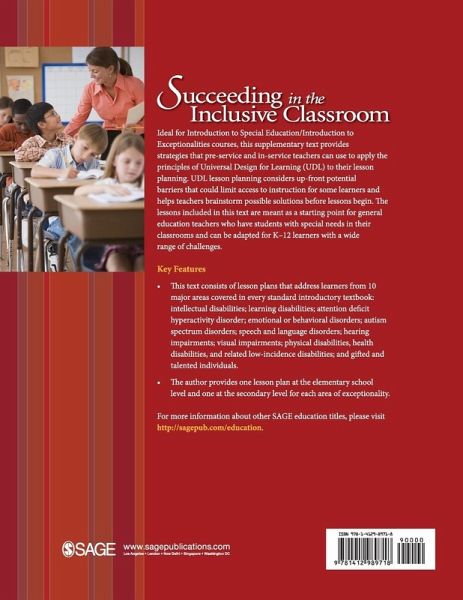 Ideal for Introduction to Special Education/Introduction to Exceptionalities courses, this supplementary text provides strategies pre-service and in-service teachers can use to apply the principles of Universal Design for Learning (UDL) to their lesson planning. UDL lesson planning considers "up front" potential barriers that could limit access to instruction for some learners and helps teachers brainstorm possible solutions before lessons begin. The lessons included in this text are meant as a starting point for general education teachers who have students with special needs in their classrooms and can be adapted for K-12 learners with a wide range of challenges. Metcalf provides one lesson plan at the elementary school level and one at the secondary level for each area of exceptionality.