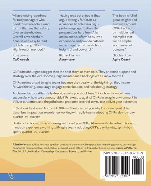 "This is an absolutely brilliant book. If you really wants to learn more regarding OKRs in Agile and other important stuff related to it you must read this book. It's truly a master piece." "Super easy to read, with clear chapter summaries. Lots of solid content that is not hidden amongst fluff. Straight to the point and a must have for any agile practitioner curious about OKRs." "Allan's writing is perfect for busy managers who need to set objectives and form initiatives that satisfy diverse stakeholders. Plus, it doesn't sugar-coat OKRs - they are part of a management system - not a medicine. Overall, a wonderfully concise and easy to read guide to using OKRs. Highly recommended." OKRs are about goals bigger than the next story, or even epic. They prioritise purpose and strategy over the ever looming, high maintenance backlogs we all know too well. OKRs are important to agile teams because they deal with the big things, they inspire forward thinking, encourage engage senior leaders, and help debug strategy. Acclaimed author Allan Kelly describes why you should use OKRs, how to write them successfully, how to set measurable KRs, execute against OKRs in an agile environment to deliver outcomes, and the pitfalls and problems to avoid so you can deliver your outcomes. In this book he doesn't try to sell OKRs - others can tell you why OKRs are great. Allan describes his practical experience working with agile teams adopting OKRs, day-by-day, quarter-by-quarter. Unlike other books, this is not designed to sell you OKRs, Allan reveals decades of honest, hands on experience working with agile teams adopting OKRs, day-by-day, sprint-by-sprint, quarter-by-quarter. So you can get aligned, work seamlessly and hit goals efficiently.