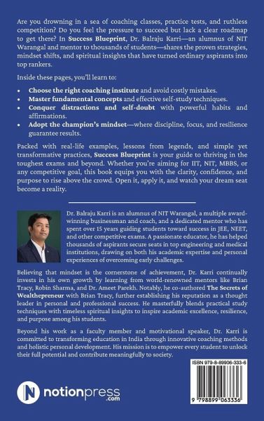 Are you drowning in a sea of coaching classes, practice tests, and ruthless competition? Do you feel the pressure to succeed but lack a clear roadmap to get there? In Success Blueprint, Dr. Balraju Karri-an alumnus of NIT Warangal and mentor to thousands of students-shares the proven strategies, mindset shifts, and spiritual insights that have turned ordinary aspirants into top rankers. Inside these pages, you'll learn to: - Choose the right coaching institute and avoid costly mistakes. - Master fundamental concepts and effective self-study techniques. - Conquer distractions and self-doubt with powerful habits and affirmations. - Adopt the champion's mindset-where discipline, focus, and resilience guarantee results. Packed with real-life examples, lessons from legends, and simple yet transformative practices, Success Blueprint is your guide to thriving in the toughest exams and beyond. Whether you're aiming for IIT, NIT, MBBS, or any competitive goal, this book equips you with the clarity, confidence, and purpose to rise above the crowd. Open it, apply it, and watch your dream seat become a reality.