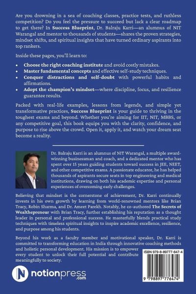 Are you drowning in a sea of coaching classes, practice tests, and ruthless competition? Do you feel the pressure to succeed but lack a clear roadmap to get there? In Success Blueprint, Dr. Balraju Karri-an alumnus of NIT Warangal and mentor to thousands of students-shares the proven strategies, mindset shifts, and spiritual insights that have turned ordinary aspirants into top rankers. Inside these pages, you'll learn to: - Choose the right coaching institute and avoid costly mistakes. - Master fundamental concepts and effective self-study techniques. - Conquer distractions and self-doubt with powerful habits and affirmations. - Adopt the champion's mindset-where discipline, focus, and resilience guarantee results. Packed with real-life examples, lessons from legends, and simple yet transformative practices, Success Blueprint is your guide to thriving in the toughest exams and beyond. Whether you're aiming for IIT, NIT, MBBS, or any competitive goal, this book equips you with the clarity, confidence, and purpose to rise above the crowd. Open it, apply it, and watch your dream seat become a reality.