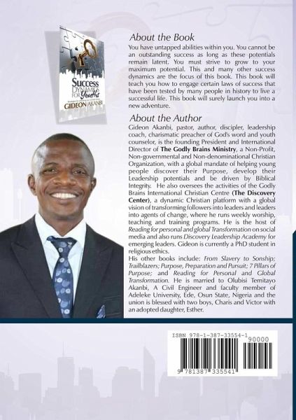 You have untapped abilities within you. You cannot be an outstanding success as long as these potentials remain latent. You must strive to grow to your maximum potential. This and many other success dynamics are the focus of this book. This will teach you how to engage certain laws of success that have been tested by many people in history to live a successful life. This book will surely launch you into a new adventure.