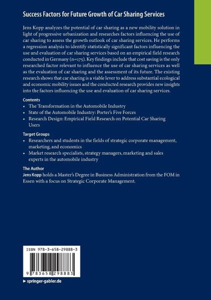 Jens Kopp analyzes the potential of car sharing as a new mobility solution in light of progressive urbanization and researches factors influencing the use of car sharing to assess the growth outlook of car sharing services. He performs a regression analysis to identify statistically significant factors influencing the use and evaluation of car sharing services based on an empirical field research conducted in Germany (n=175). Key findings include that cost saving is the only researched factor relevant to influence the use of car sharing services as well as the evaluation of car sharing and the assessment of its future. The existing research shows that car sharing is a viable lever to address substantial ecological and economic mobility issues and the conducted research provides new insights into the factors influencing the use and evaluation of car sharing services.